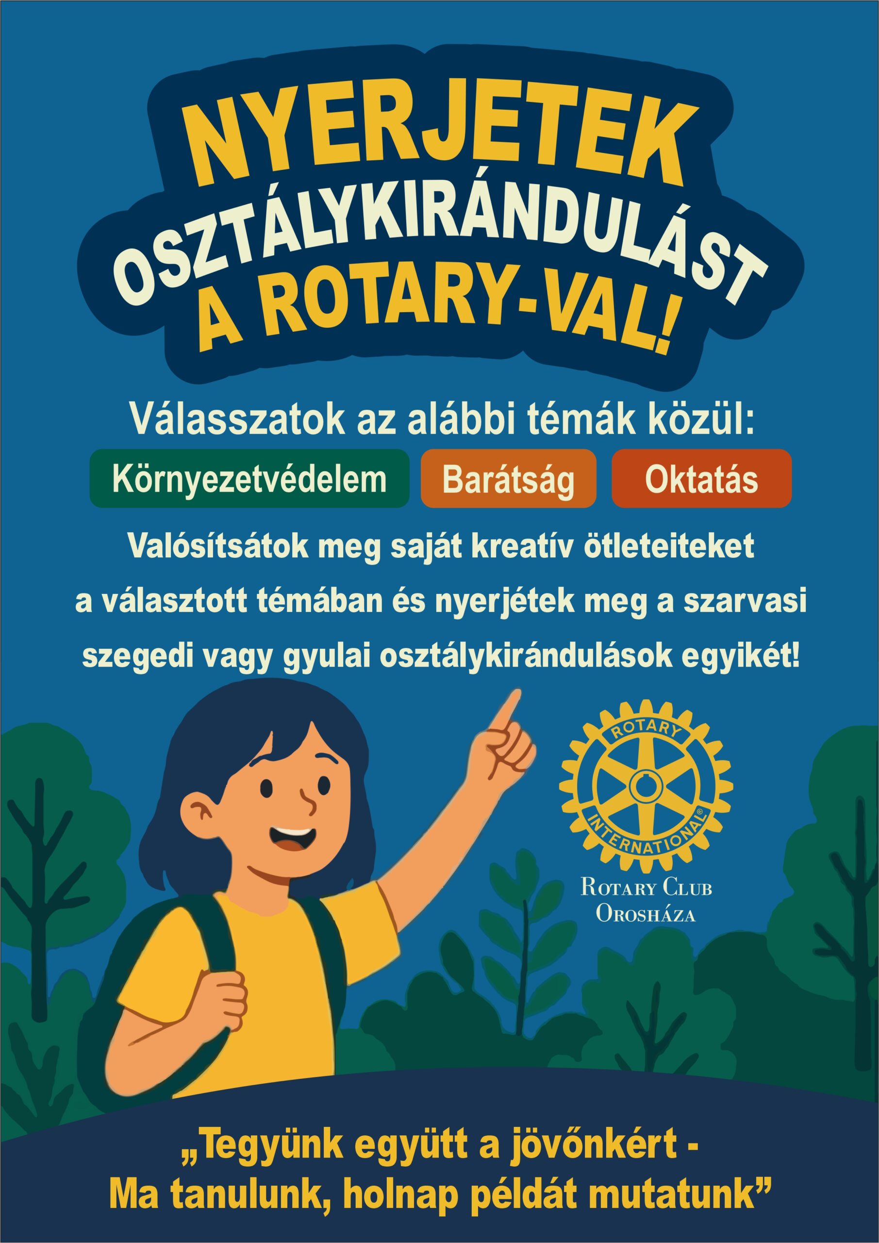 A Rotary Club Orosháza pályázatot hirdet az Orosháza városban működő általános iskolák felső tagozatos osztályai számára. A pályázat célja a diákok környezettudatosságának fejlesztése, a közösségi felelősség és együttműködés erősítése, a helyi értékek megismertetése. A pályázat keretein belül a résztvevő osztályok önköltséges alapon különböző saját projekteket valósítanak meg, a legötletesebb, legkreatívabb, legnagyobb hatással bíró projekteket a Rotary Club Orosháza jutalom osztálykirándulással ismeri el.